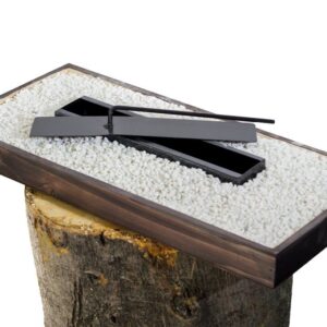 Chimenea bioetanol tipo bandeja madera incluye con la compra accesorios para encendido de la chimenea: un litro de Bioetanol, piedra decorativa, apaga llama, encendedor largo, vaso dosificador y fibra ahorradora Bioetanol.